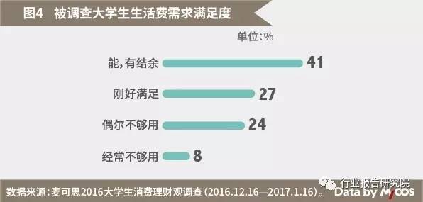 在被调查学生中,41%的学生生活费能够满足日常需求,并有结余。超三成大学生曾入不敷出。调查显示,24%的学生偶尔生活费不够用,8%经常不够用。