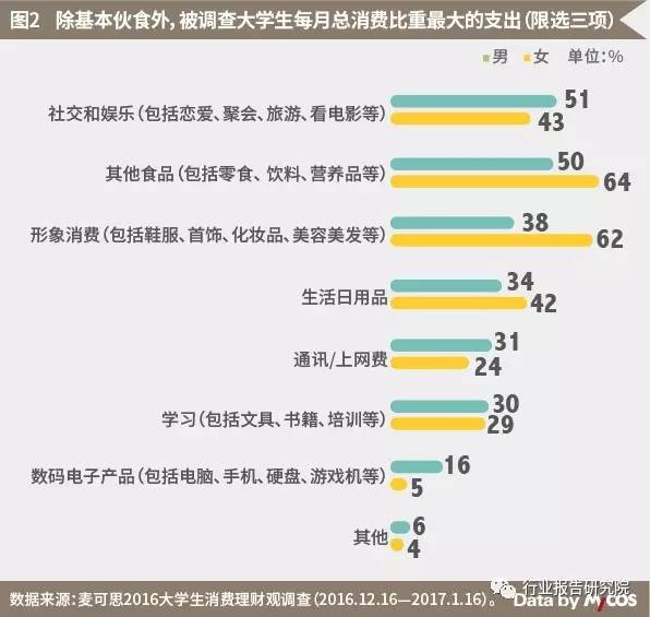 1212元的消费都花在了哪里呢?被调查学生选出了每月消费比重最大的三项支出。除去基本伙食费外,大学生最爱的是“吃”,零食、饮料和营养品等其他食品(58%)是最大的支出项。男生每月主要消费在社交和娱乐(51%)、其他食品(50%)和形象消费(38%)方面,女生每月主要在其他食品(64%)、形象消费(62%)和社交与娱乐(43%)方面消费。男生将钱用在通讯/上网费(31%)和数码电子产品方面(16%)的比例分别比女生高7个和11个百分点,用于形象消费方面比例(38%)则比女生低24个百分点。