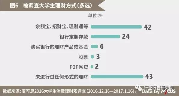 手里握着生活费,大学生是否会理财让“钱生钱”呢?调查显示,57%的学生通过不同形式进行过理财。被调查大学生中,42%选择了余额宝、招财宝、理财通等产品,24%的学生选择传统的银行定期存款的形式,购买股票和投资P2P网贷的学生仅占3%和2%。大多数学生选择的是低风险、稳健性的理财方式。